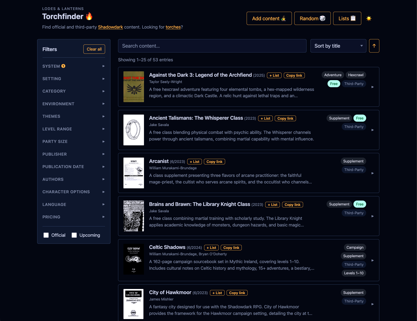 I’ve learned a fair amount about the game. Part of my learning has involved building Torchfinder at Lodes & Lanterns. Personally, I wanted a tool that could sort and filter Shadowdark content, including adventures, supplements, and zines.